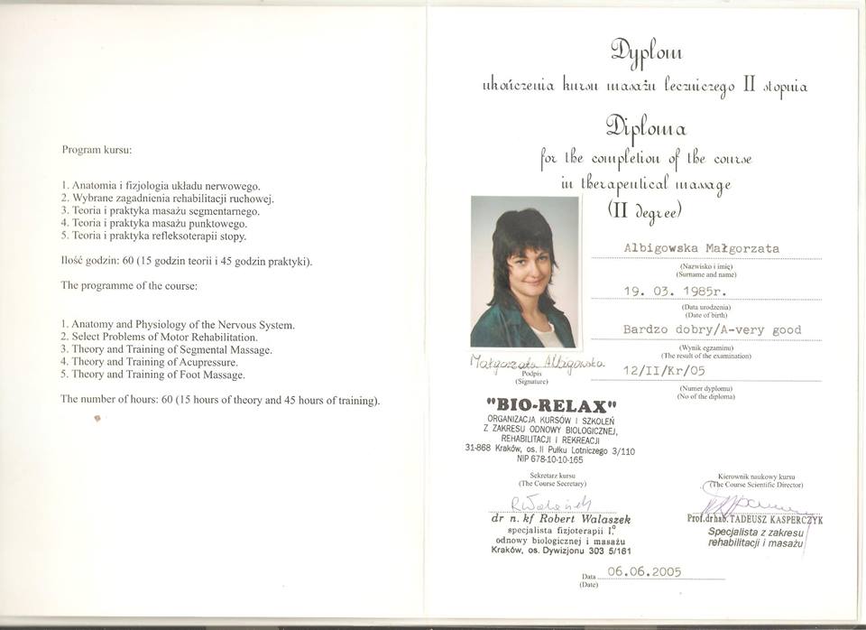 - 2005 – Masaż Leczniczy II stopnia „Bio-Relax”
