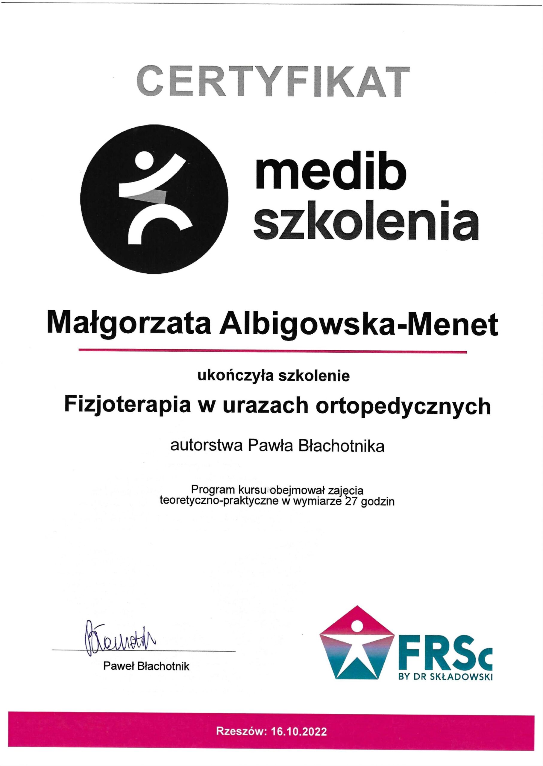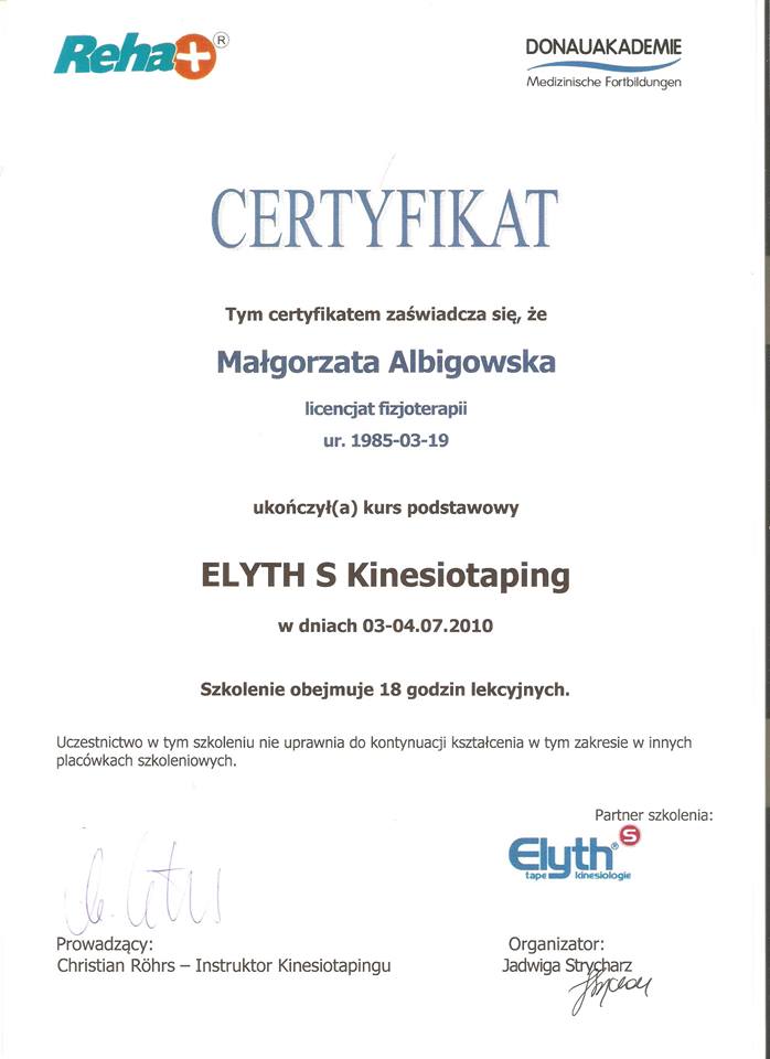 - 2013-2014 – Współczesne metody diagnostyki i terapii tkanek miękkich dr Ciechomskiego, VI stopni zakończone egzaminem, „Ag-Reh”